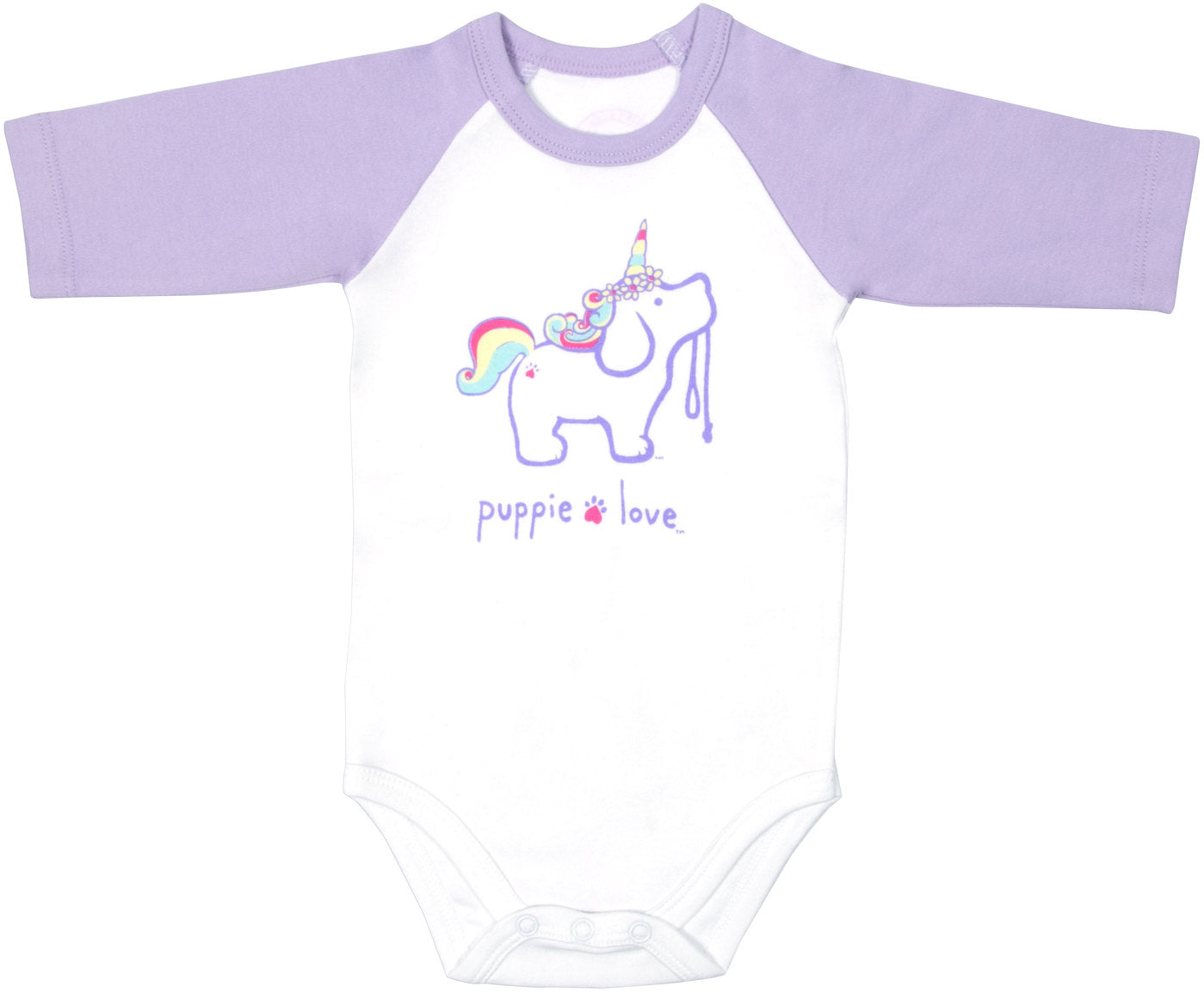 "Puppie Love" text and accompanying unicorn icon detailing are printed onto the front of the bodysuit.